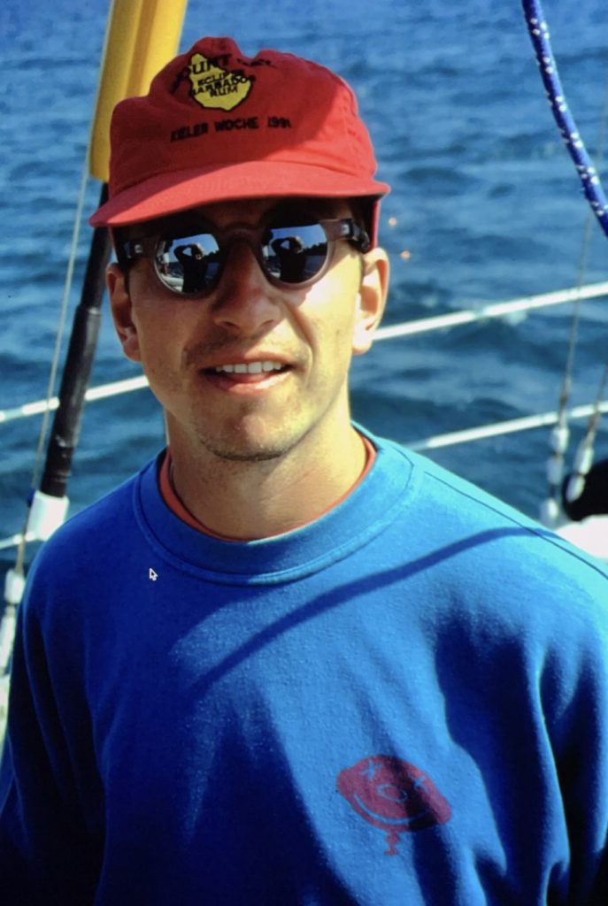 Ich gehe auf Spurensuche: Bei meinen Eltern zuhause finde ich Bilder meines Vaters, die von einer Segelreise stammen als er ungefähr in meinem Alter war. Auf dem Segelboot trägt er einen mittelblauen Sweater aus Baumwolle mit einem violett aufgedruckten Smiley-Luftballon auf der linken Brust. Die Augen des Smileys sind durchgekreuzt wie bei toten Comic-Figuren. Er lächelt leicht unrasiert in die Kamera. Verwegen und cool. Vor der Sonne schützt ihn eine Sonnenbrille mit runden verspiegelten Gläsern, wie sie nur Designer in den 90ern ersinnen konnten. Auf dem Kopf eine knautschige rote Kappe. „Kieler Woche 1991“ steht darauf. Ein anderes Bild. Papa lehnt lässig mit einem Kumpel an der Seite des Segelboots. Die Kappe sitzt jetzt schräg auf dem Kopf. Die verspiegelte Sonnenbrille ist einer RayBan Wayfarergewichen. Obenrum: Pinker Fleecepullover mit blauen Details, aufgestelltem Kragen und Knopfleiste mit Druckknöpfen bis zum Brustbein. Untenrum: Blau-gelbe Badehose. An den Füßen trägt er navy-blaue Cotton Canvas Deck Shoes. Lässig. Ein Vintage-Outfit, um das ihn jeder Jugendliche beneiden würde.